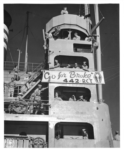 Rather than be subjugated to these camps, the government gave young and able-bodied Japanese American men the option to enlist in the military. To accommodate the new recruits, the Army created a special segregated unit called the 100th Infantry Battalion. Composed of more than 1,400 second-generation Japanese Americans—or Nisei—from Hawaii and the mainland, the unit’s motto “Go for Broke” was a nod to a slang term used by gamblers in Hawaii meaning to risk everything to win big. Battalions of soldiers brought that mindset with them while stationed in Italy. Later, the government integrated the unit into the 442nd Regimental Combat Team, with troops engaging in combat in Italy and France. The men fought for American victory against the Axis Powers of Germany, Italy, and Japan, even while others like them—sometimes family members—remained in internment camps back home on U.S. soil.