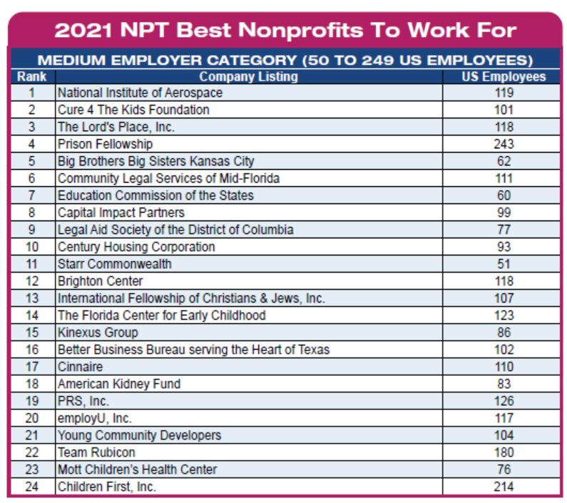 In this year’s awards, medium organizations—those with 50 to 249 employees, including Team Rubicon—accounted for almost half of the 50 Best Nonprofits, with 24 honorees. Small organizations, considered those with 15 to 49 employees, nabbed 20 of the 50 spots (40%), including No. 1 and No. 2. There were six large organizations, those with 250 or more employees, that made the final cut.