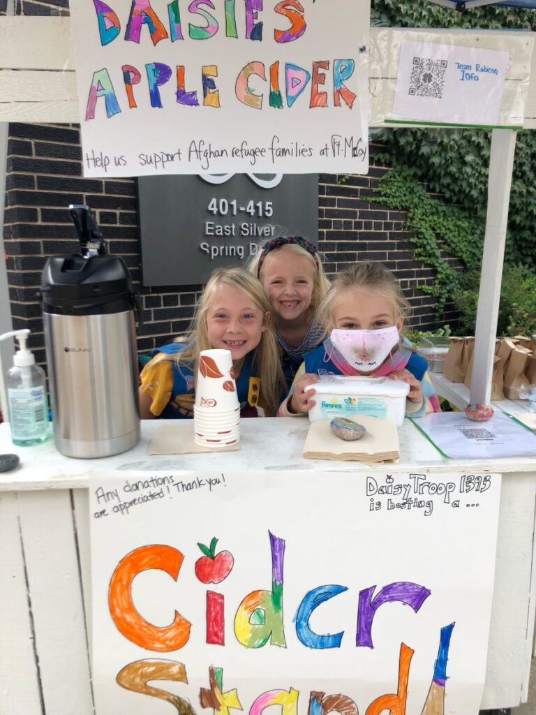 “I was very happy and excited and I wanted to help the Afghan refugee families,” says Nora of the troop’s day selling cider. “We raised a lot of money to get them coats, so I was so, so happy.”