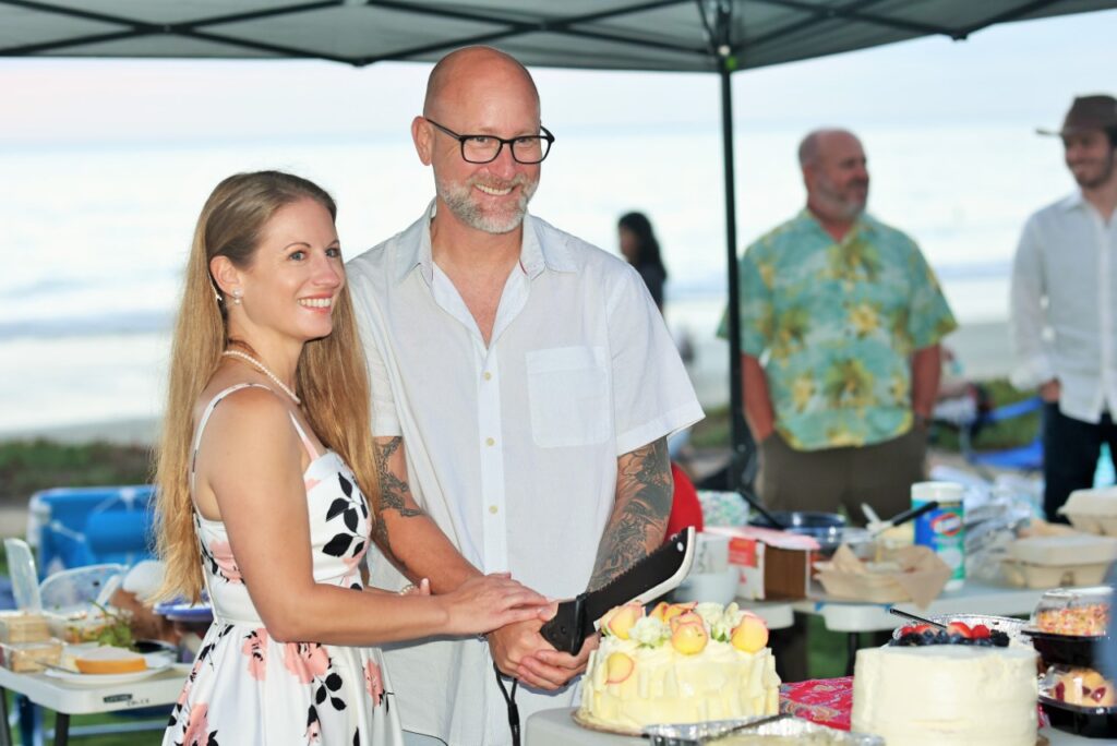 “That first “date” was on the beach in Del Mar for sunset,” says Brown. “We sat in the sand for five hours, drank lots of wine, got parking tickets, almost froze, and loved it.”